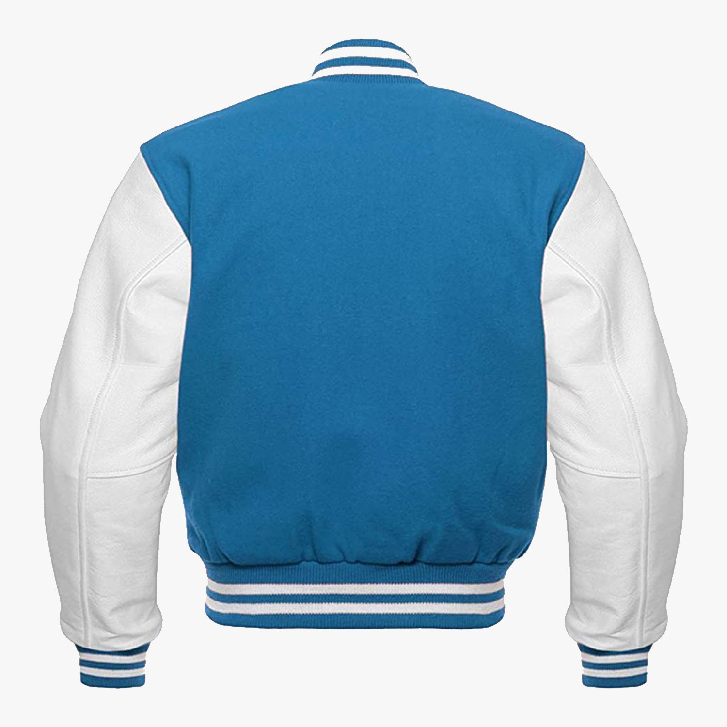 • Jacket Style: Blue varsity Jacket With white Leather Sleeves.