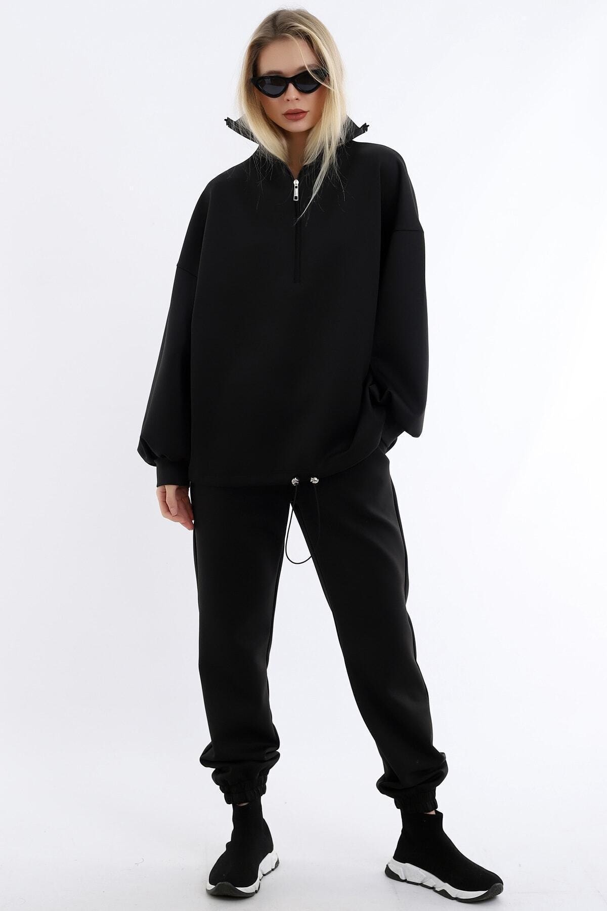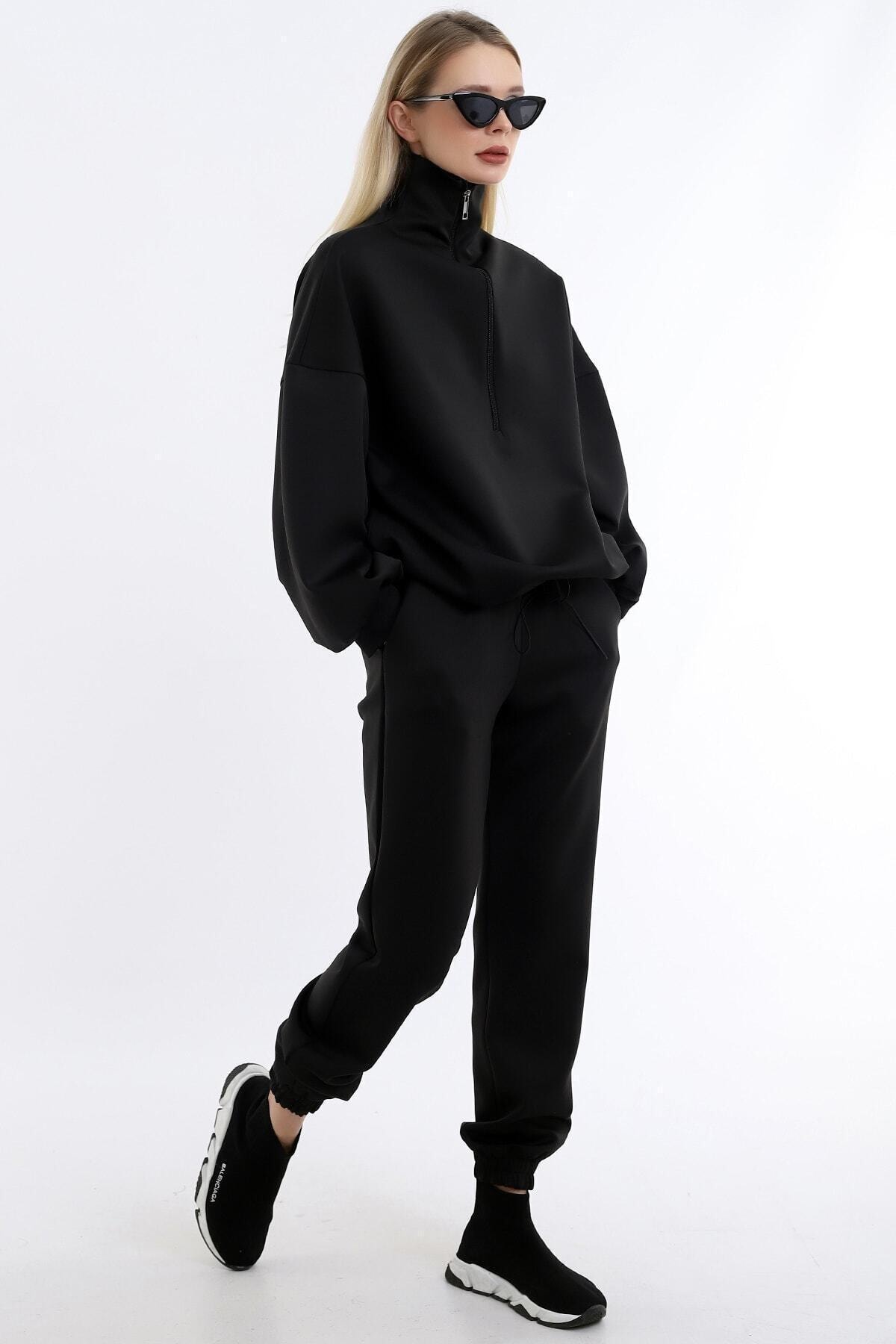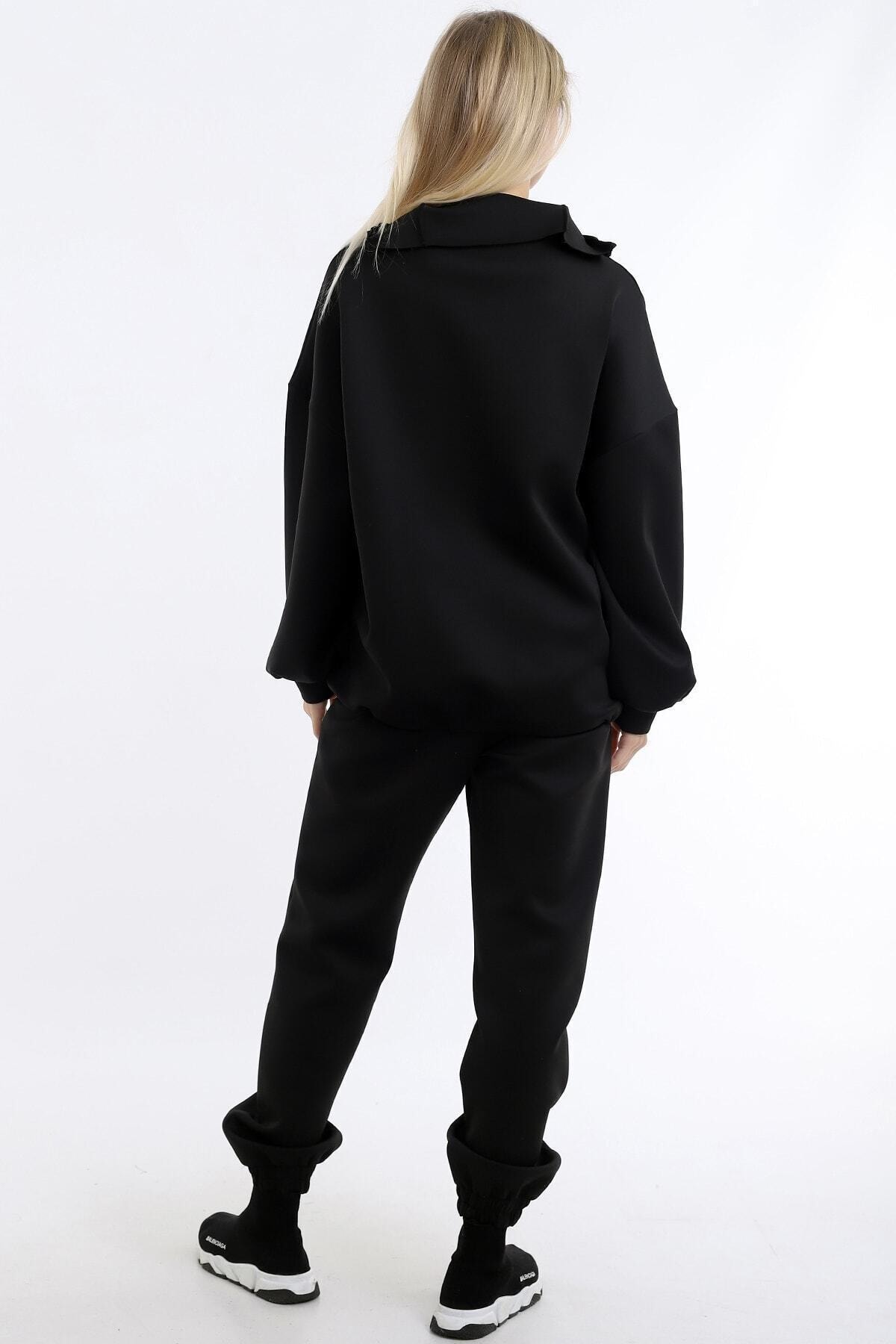 Women’s Black Collar Long Zippered Scuba Fabric Comfortable Stylish And Sporty Jogging Suit